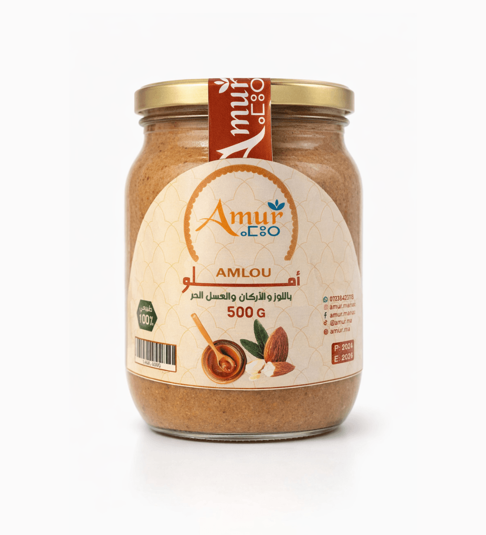 أملو باللوز هو منتج تقليدي مغربي فاخر، يُحضَّر من مزيج طبيعي من اللوز المحمص المطحون، وزيت زيتون، والعسل الطبيعي. يتميز بقوامه الكريمي الغني ومذاقه اللذيذ الذي يجمع بين حلاوة العسل ونكهة اللوز المحمص.